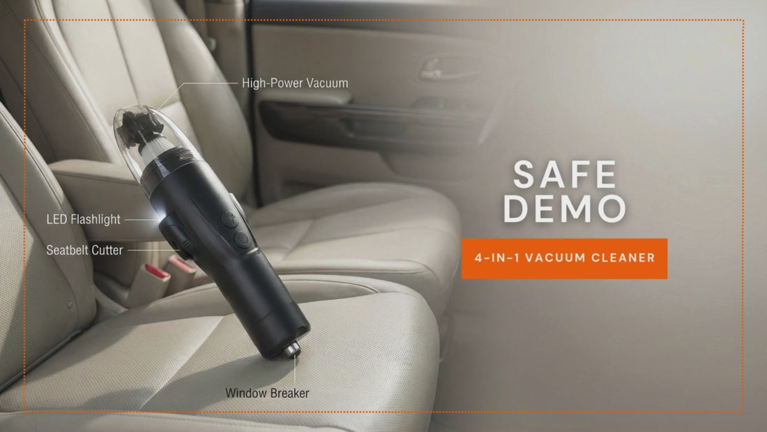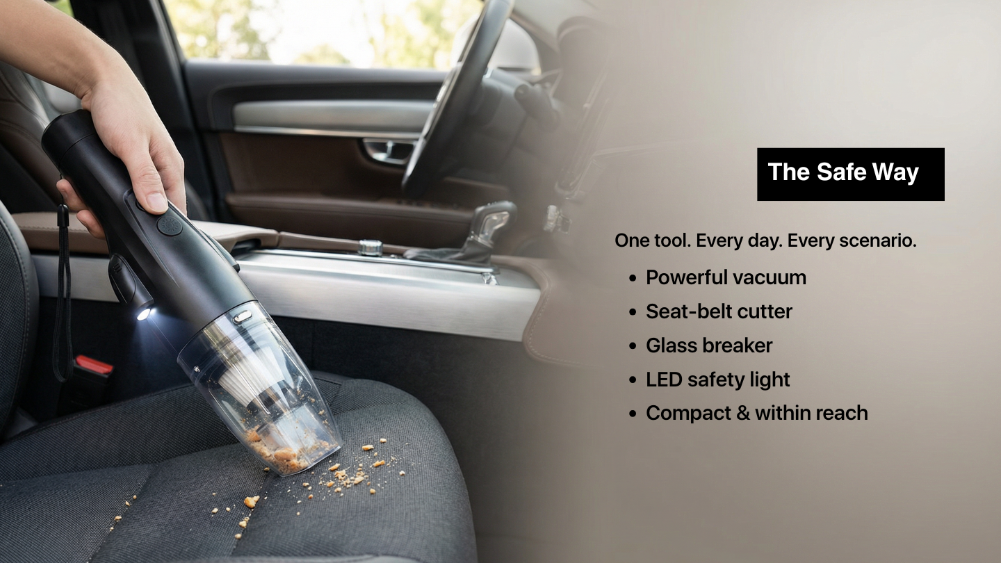 SAFE is an all-in-one car tool designed for everyday use and unexpected moments. It works as a powerful handheld vacuum for quick cleanups and includes built-in safety tools like a seat-belt cutter, glass breaker, and LED flashlight, so you’re always prepared without carrying separate devices.